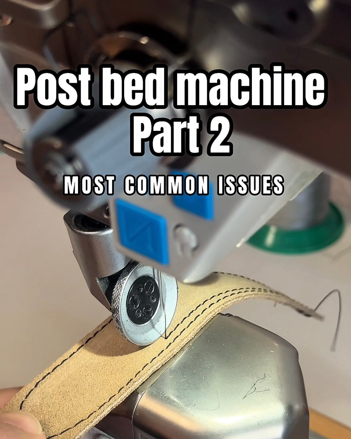 At the top of the column is the needle, which moves up and down and carries the upper thread through the material. Directly above it operates the presser foot, whose role is to stabilize the leather or fabric during sewing. Post-bed machines often use roller presser feet so they do not restrict movement when working on curved parts.