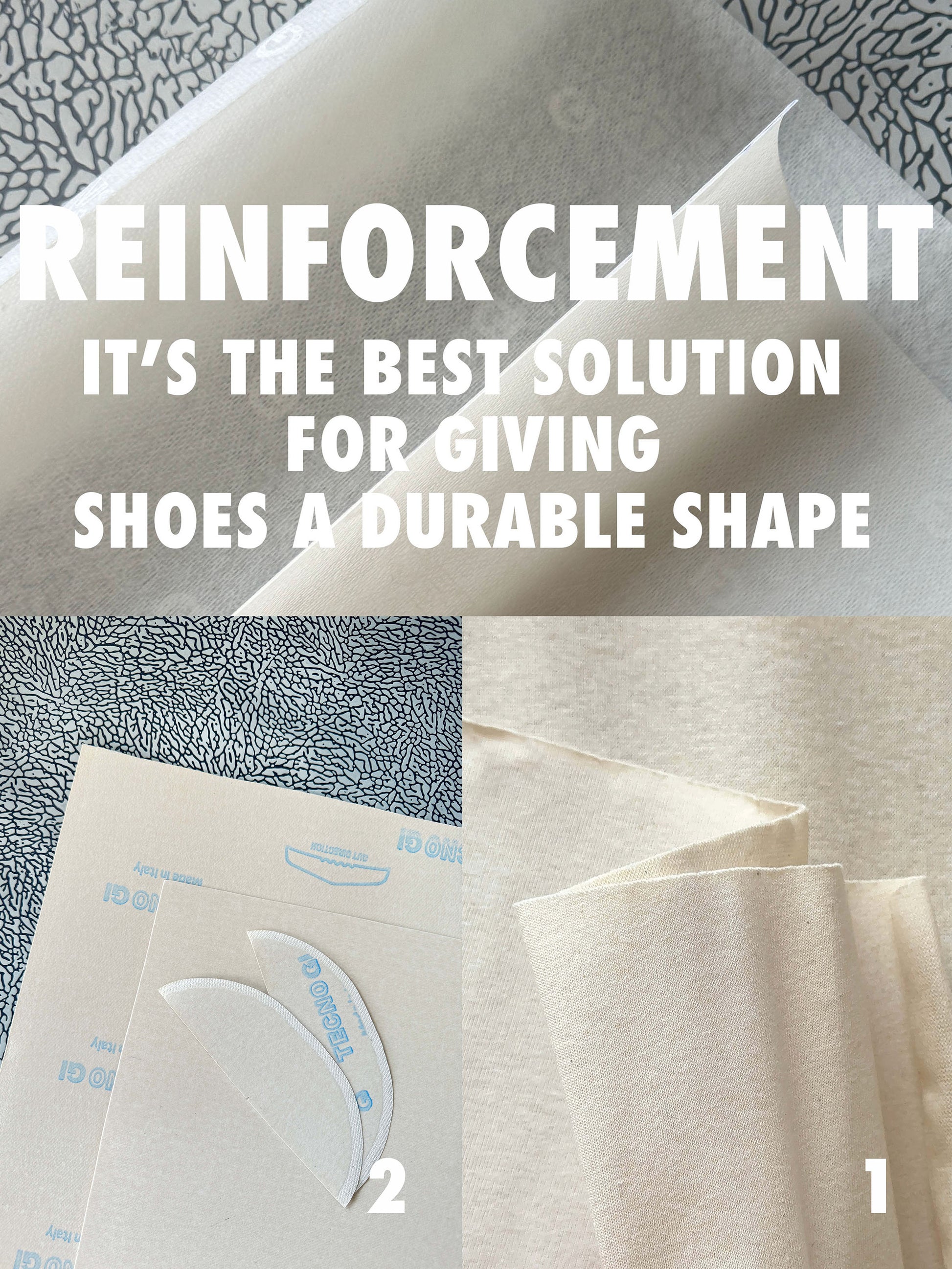 1. **Reinforcement for Upper Pieces:** This is a stiff thermoactive material that works excellently to stiffen upper components. If the materials or leathers you are using are too soft, this is the best solution. Thanks to this material, the upper will retain the shape formed on the last and won’t deform.