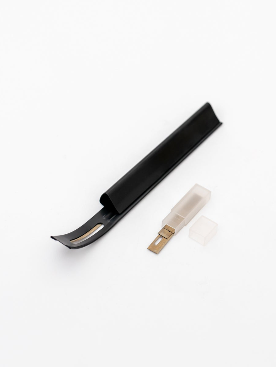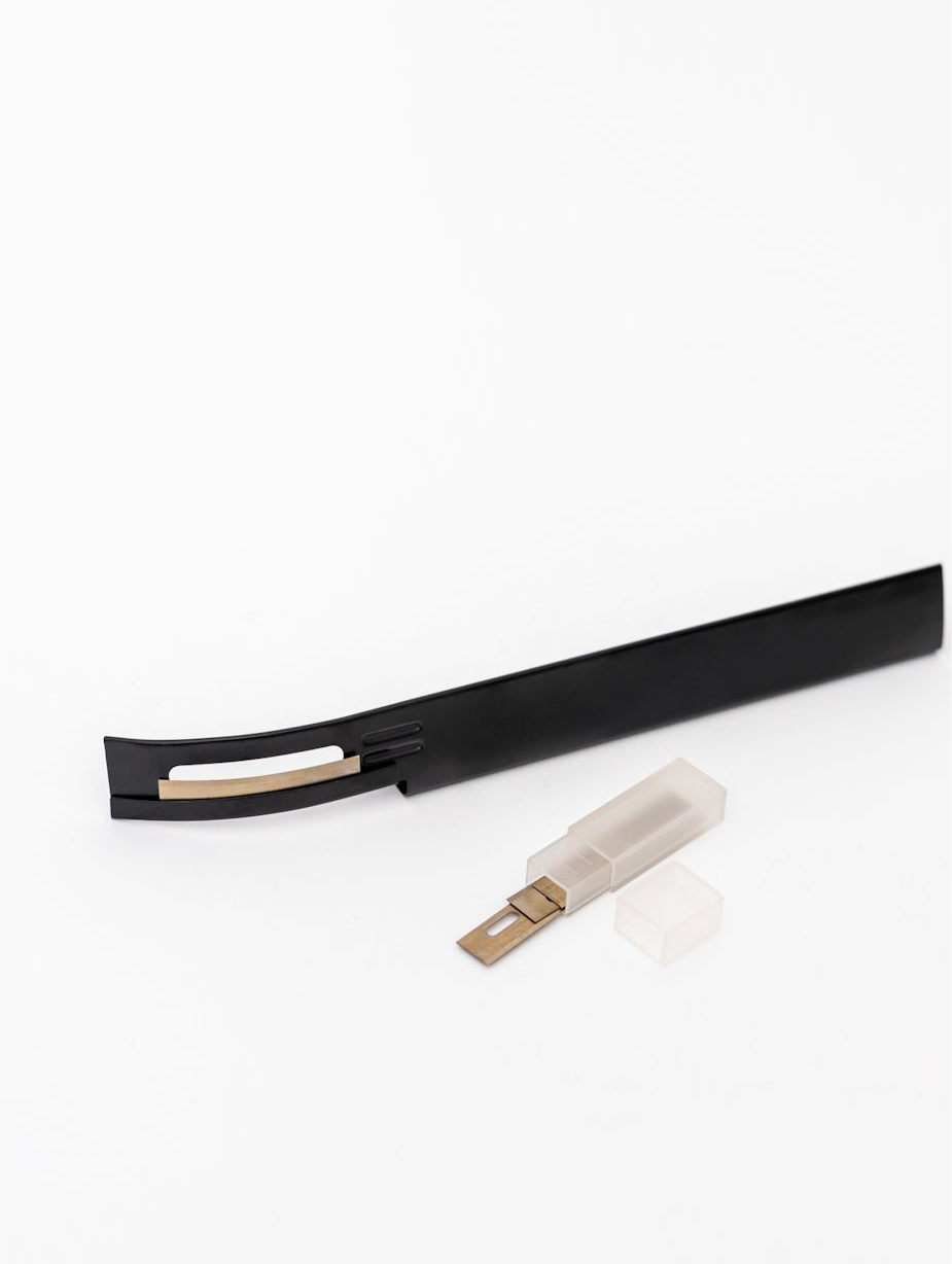 A practical leatherworking tool designed for thinning and skiving leather edges in areas where layers overlap — such as seams, folds, or reinforcements. The sharp, replaceable blade allows controlled material removal without damaging the surface, ensuring smooth transitions and professional-looking finishes.
